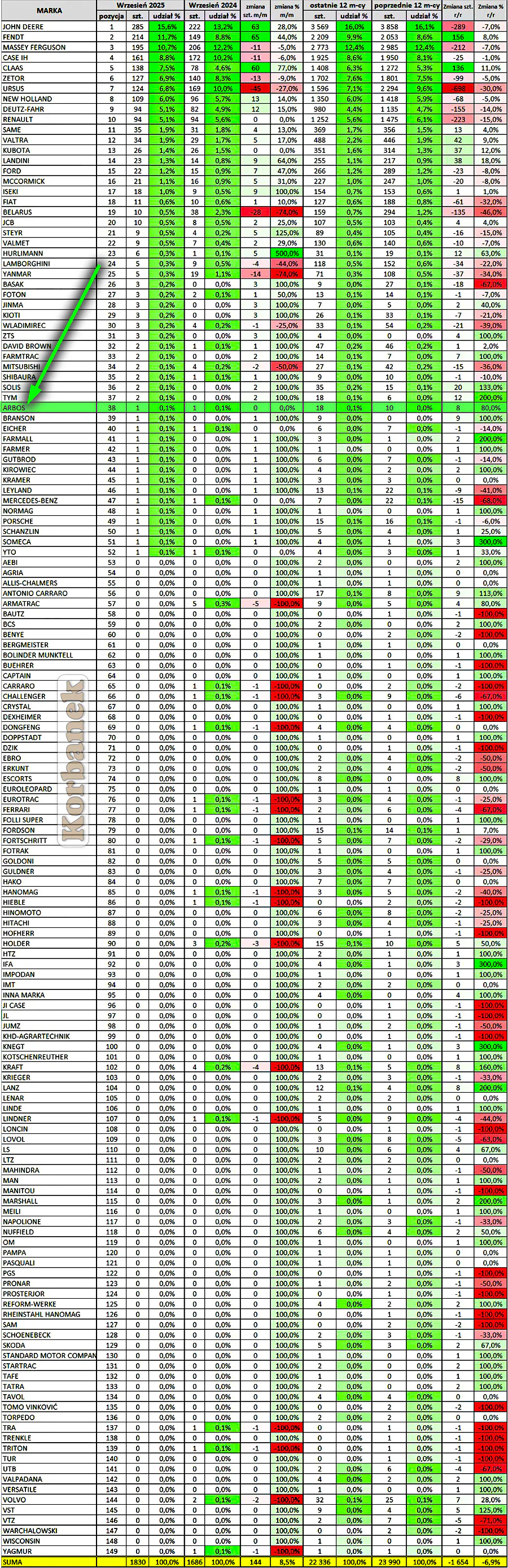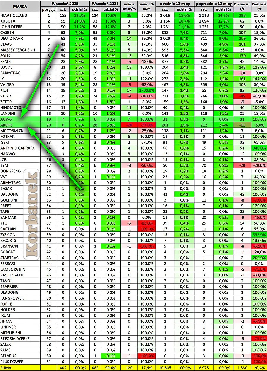Fenomenalny debiut marki przyszłości AUPAX (pozycja 19) - Spektakularne wejście! ARBOS (pozycja 20) - Włosko-chiński kombatant Kluczowe trendy na polskim rynku nowych ciągników Premium (Fendt, John Deere, Claas) - dla dużych, zaawansowanych gospodarstw Nowi gracze - Wrzesień 2025 to miesiąc debiutów: AUPAX (Weichai) Trudności tradycyjnych marek - Niektóre uznane marki tracą udział: STEYR -17% r/r Polski rynek nowych ciągników rolniczych w 2025 roku to dynamiczny, konkurencyjny ekosystem z wyraźnym trendem wzrostowym (+20,4% r/r). 63 rejestracje (7,9% udziału) 63 rejestracje (7,9% udziału) 40 rejestracji (5,0% udziału) Ogólna sytuacja rynku używanych ciągników: JOHN DEERE (15,6%, 285 szt.) - bezapelacyjny lider Pozycja ARBOS (miejsce 38) Perspektywa roczna (ostatnie 12 miesięcy): 18 rejestracji używanych ciągników (+8 szt., +80% r/r!) Co to oznacza dla marki ARBOS? Włoskie dziedzictwo designu i inżynierii (tradycja traktora włoskiego) Perspektywy rozwoju Pierwsi właściciele są zadowoleni - skoro sprzedają swoje ARBOS, to znaczy że chcą wymienić na nowsze modele lub wykorzystali je zgodnie z planem Fakt, że ciągniki ARBOS i rebranding AUPAX pojawiają się na rynku wtórnym i znajdują nabywców, to najlepsza wizytówka dla marki: Warto zauważyć inne dynamicznie rozwijające się marki na rynku wtórnym: CLAAS +77% m/m (138 rejestracji) Jednak ARBOS z +80% wzrostem rocznym plasuje się wśród najszybciej rosnących marek w perspektywie długoterminowej! Rynek używanych ciągników w Polsce pozostaje stabilny z tendencją wzrostową w ujęciu miesięcznym. ARBOS systematycznie buduje swoją pozycję - wzrost o 80% rok do roku to imponujący wynik, który potwierdza, że marka z portfolio Weichai zyskuje coraz większe uznanie wśród polskich rolników. Paweł Korbanek – Prezes firmy Korbanek sp z o.o. informuje: "Rewolucja na polskim rynku ciągników jest faktem: marki azjatyckie notują wzrosty przekraczające 100% rocznie, oferując niezrównaną relację ceny do jakości. Weichai z markami Aupax i Arbos to symbol tej transformacji – łączą włoskie dziedzictwo z chińską efektywnością produkcyjną."– mówi Paweł Korbanek, Prezes firmy Korbanek sp. z o.o. i ekspert rynku maszyn rolniczych.Rejestracje ciągników rolniczych w Polsce wrzesień 2025 i chiński ciągnik Aupax w tle