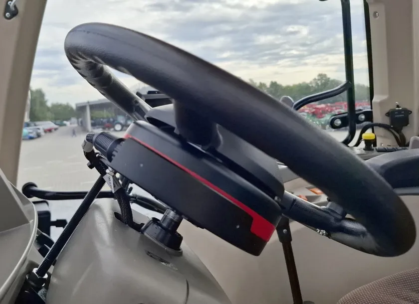 - Kierownica z silnikiem elektrycznym o niskim profilu, zapewniająca automatyczne i precyzyjne prowadzenie ciągnika.