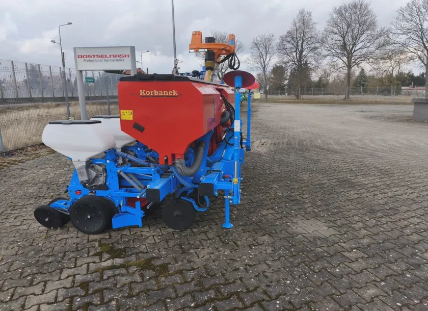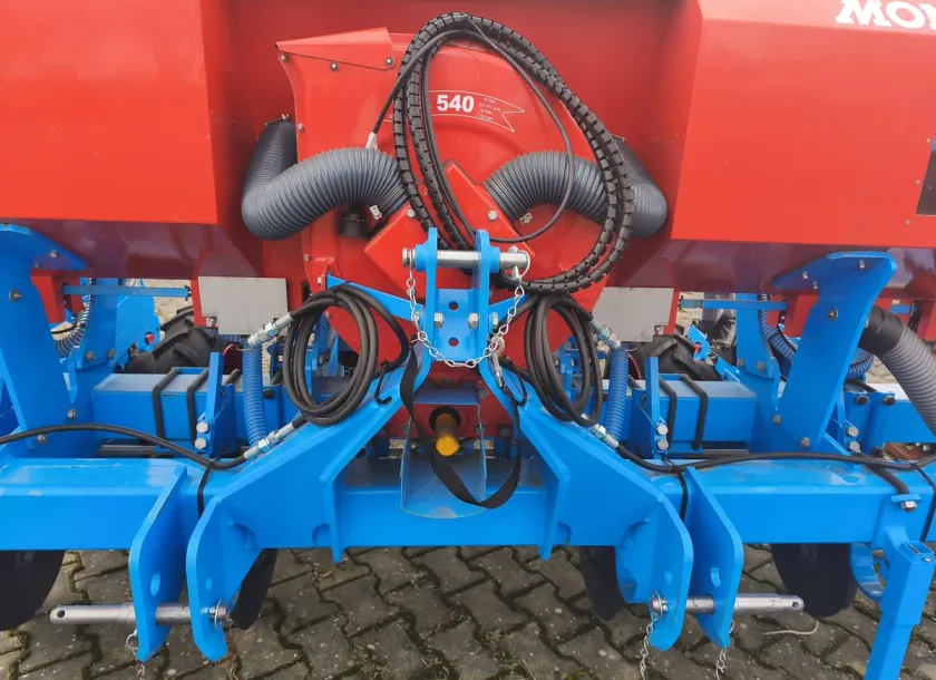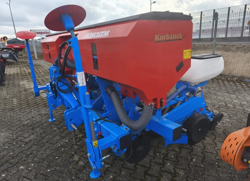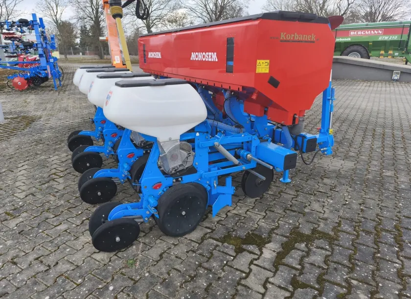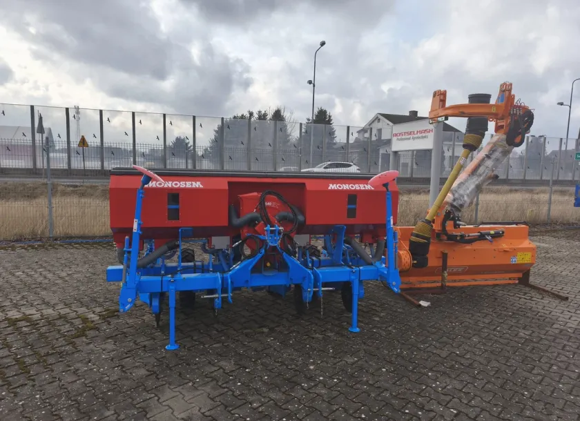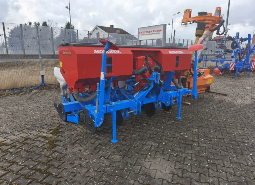 Siewnik punktowy Monosem, powystawowy, w bardzo dobrym stanie, 4-rzędowy, talerzowy, w wyposażeniu duży podsiewacz nawozów 980 litrów oraz kontroler wysiewu z fotokomórkami i konsolą montowaną w kabinie ciągnika.