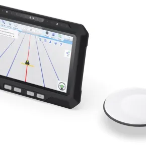 Ilustracja powyżej: Nawigacja rolnicza AllyNav AF100 z tabletem z ekranem 10,1-calowym (z obsługą dotykową) i odbiornikiem (anteną) GNSS.