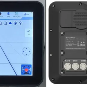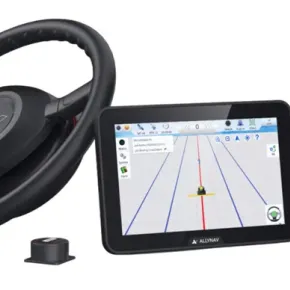 Nawigacja rolnicza AF 303 chińskiego producenta AllyNav: System składa się z kilku komponentów, w skrócie mówiąc jest to nawigacja rolnicza z automatyczną kierownicą, z tabletem z oprogramowaniem i z odbiornikiem GNSS z wysoką dokładnością pozycjonowania. W skład zestawu AF303 wchodzą: tablet obsługiwany dotykowo z wyświetlaczem (10,1-calowym) z szybkim systemem operacyjnym Android 10 i oprogramowaniem obsługowym, kamera, kierownica z silnikiem elektrycznym i odbiornik GNSS (antena R70 SMART) z wysoką precyzją pozycjonowania (o dokładności RTK +/- 2,5 cm – korekcja poprzez kartę SIM oraz ASG Eupos), obsługujący satelitarne systemy nawigacyjne GPS, GLONASS, Galileo, BDS, QZSS, SBAS, L-band.