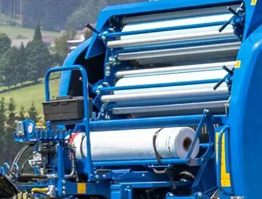 - System podwójnego wiązaniaZastosowanie systemu podwójnego owijania pozwala na skrócenie czasu owijania beli jak i czasu wymiany siatki lub folii o połowę.