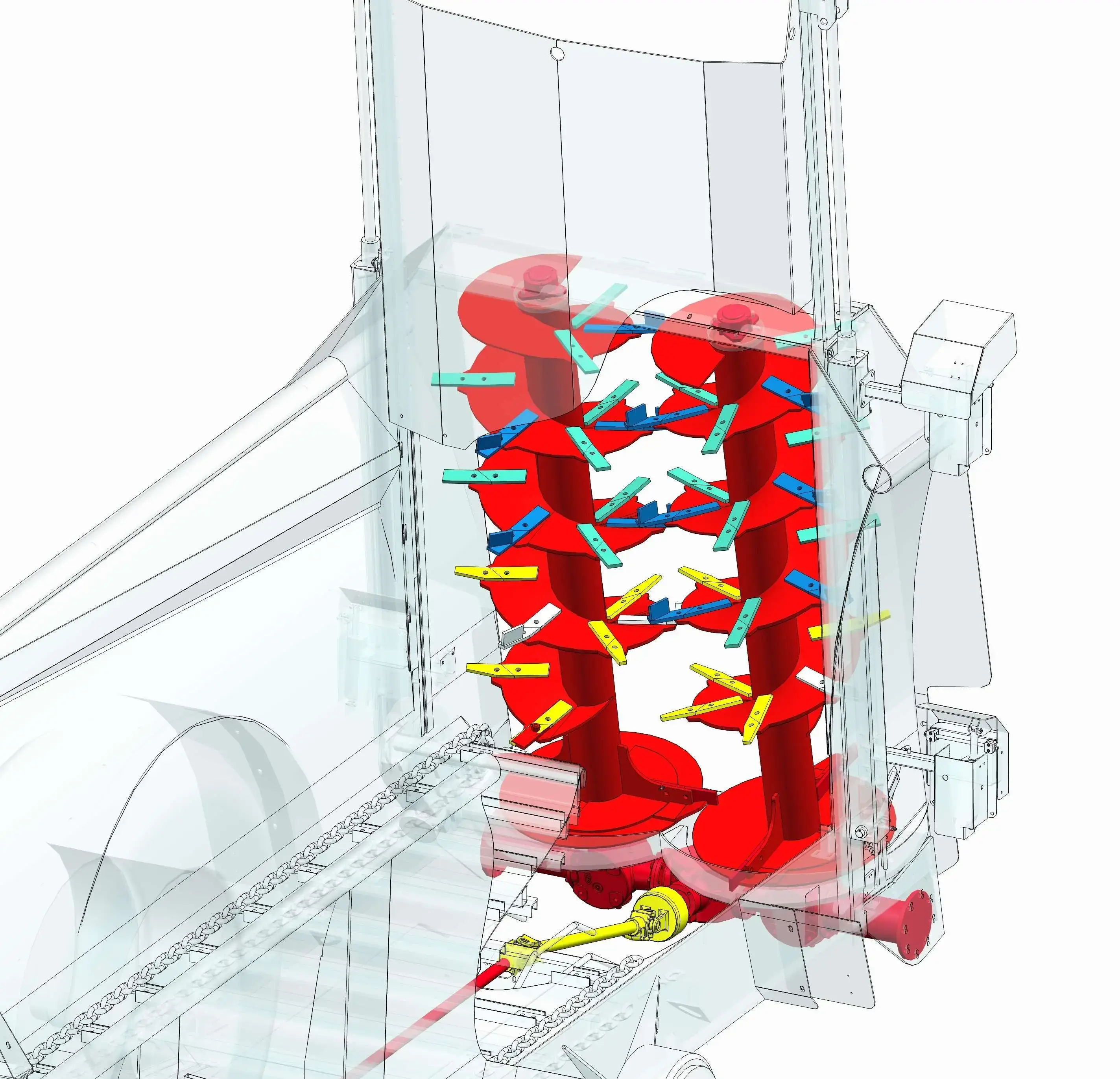 2 poziome ślimaki z palcami 50 × 12 wykonanymi z odpornej na ścieranie stali i 2 talerze o średnicy 900 mm umożliwiają rozdrobnienie i precyzyjny rozrzut małych dawek na dużą szerokość. Napęd odbywa się za pośrednictwem 6 przekładni monoblokowych 1000 obr./min, z automatycznym zabezpieczeniem