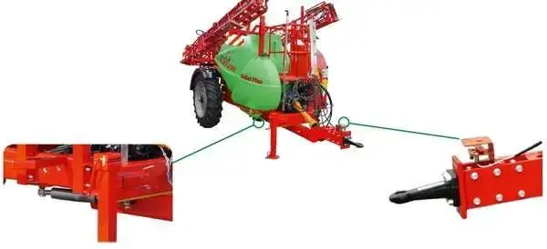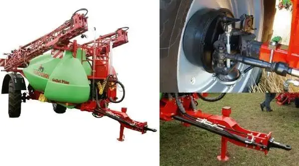 - Oś skrętna opryskiwaczaOś skrętna opryskiwacza ułatwia podążanie maszyny przyczepionej za ciągnikiem. Sterowanie zestawem ciągnik - opryskiwacz jest łatwiejsze, unika się ugniatania upraw.