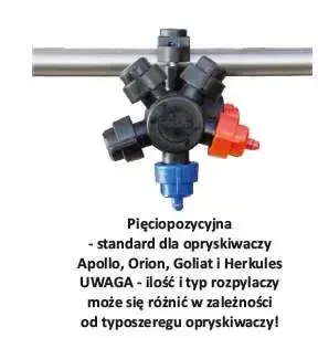 - Głowice do rozpylaczyGłowice mocujące do rozpylaczy pięciopozycyjne. Uwaga: ilość i typ opryskiwaczy można opcjonalnie dostosować do potrzeb użytkownika. Różne kolory a w związku z tym i wydatki rozpylaczy są dostępne.