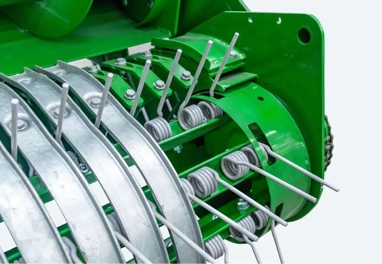 - Podbieracz bezkrzywkowyPodbieracz bezkrzywkowy o szerokości 2.1 metra jest opcjonalnym wyposażeniem wszystkich pras i prasoowijarek McHale. W tym podbieraczu producent zastosował sześć rzędów palców zbierających, gwarantujących szybkie przekazanie masy do komory prasowania oraz zapewniających doskonałe zbieranie materiału. Podbieracz bezkrzywkowy ma mniej ruchomych części i nie wymaga konserwacji.
