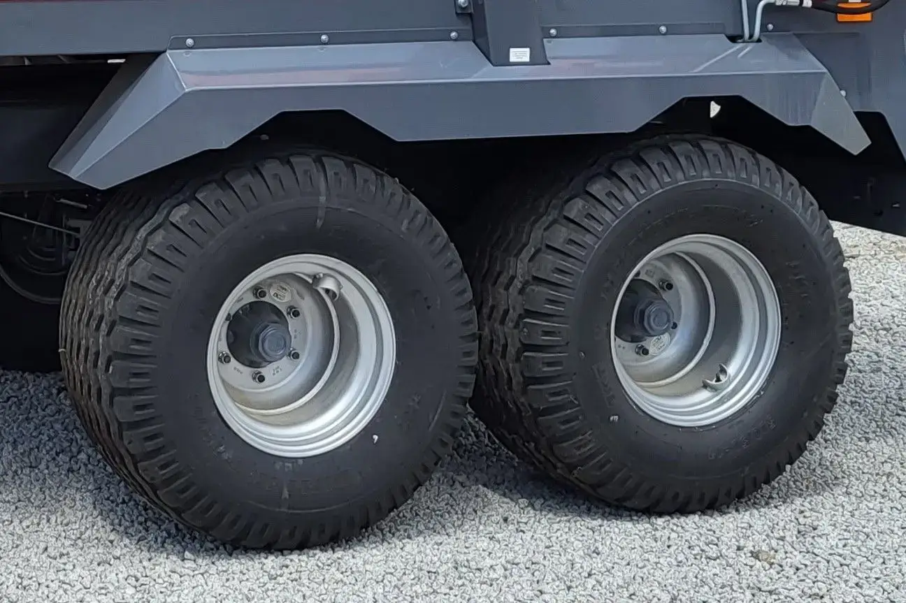- Szerokie koła 500/50-17"Ogumienie 500/50-17 zalecane do rozrzutników, które pracują w podmokłych terenach. Na szerokich kołach rozrzutnik Taurus zdecydowanie stabilniej poruszę się podczas transportu z większymi prędkościami.