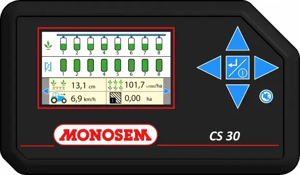 - KONTROLER WYSIEWU CS 30 COMFORT- z kolorowym wyświetlaczem 4,3'', - obsługiwany za pomocą przycisków, - kontrola wysiewu ziarna na każdym rzędzie, - odczyt powierzchni obsiewu, - odczyt prędkości roboczej, - liczenie ziarna, - odczyt średniej obsady na hektar, - odczyt średniej odległości między wysiewanym ziarnem, - programowane alarmy.