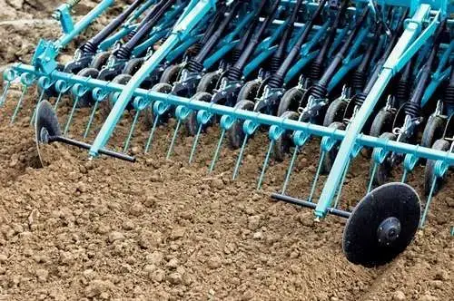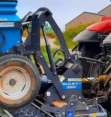 Zdjęcie powyżej: Siewnik zbożowy mechaniczny SULKY TRAMLINE zespolony z aktywną broną wirnikową, umożliwiający uprawę i wysiew w jednym przejeździe.
