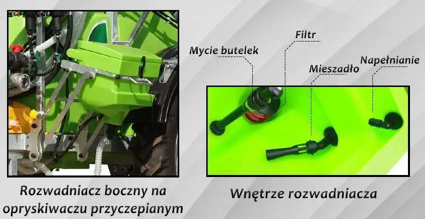 - Rozwadniacz bocznyOpcjonalny rozwadniacz boczny dla opryskiwacza przyczepianego Tolmet to rozwiązanie, które umożliwia rozwadnianie środków ochrony roślin oraz nawozów z poziomu gruntu. Rozwadniacz wyposażony jest w: sito filtrujące, dyszę do mycia butelek a także w mieszadło hydrauliczne.