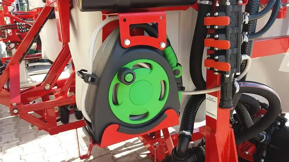 - Myjka zewnętrznaOpcjonalna myjka zewnętrzna opryskiwacza: Lanca pistoletowa z wężem 20 metrów bieżących (w bębnie) umożliwia wygodne i bezpieczne dla operatora oraz środowiska naturalnego umycie opryskiwacza z zewnątrz.