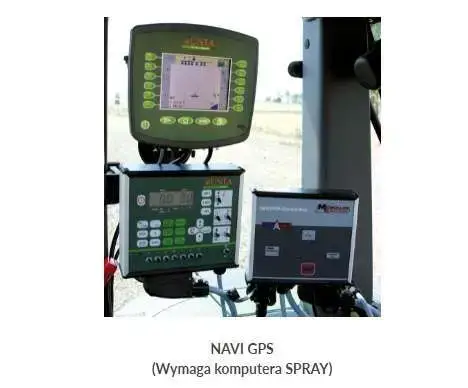 - sterowanie znacznikiem pianowym. - Nawigacja GPSNawigacja NAVI GPS zapewnia funkcje dodatkowe: - automatyczne sterowanie sekcjami układu cieczowego z procentowym stopniem nakładania (0%, 50%, 100%) - jazda równoległa (również w trybie konturowym) - tworzenie map konturowych pól - możliwość zapisywania: obrysu pola, ścieżek przejazdowych, opryskanej powierzchni, przeszkód (słupów), punktu - referencyjnego dla zwiększenia dokładności - port USB - możliwość wykorzystania jazdy równoległej do innych maszyn (np rozsiewaczy)