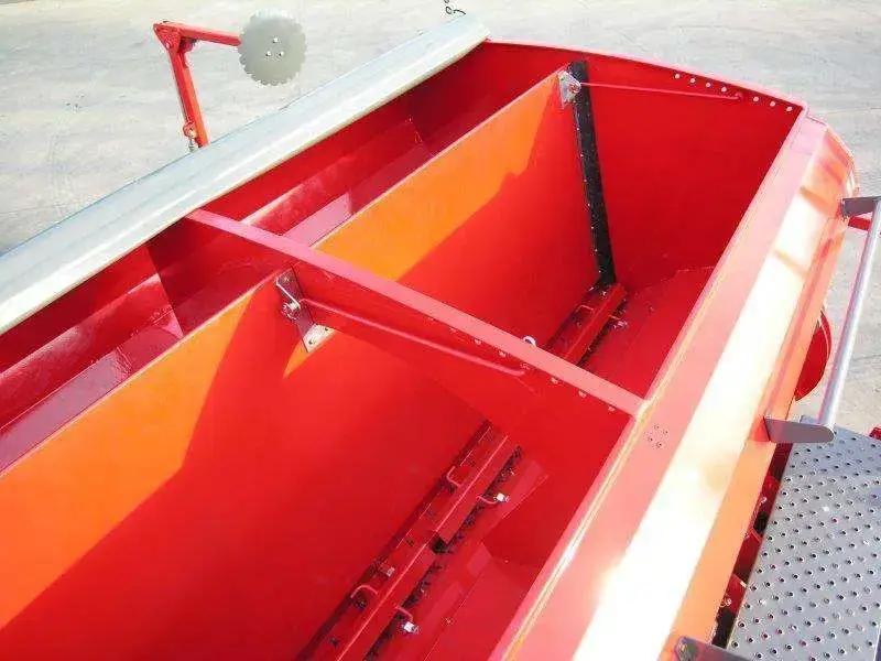- Zbiornik dzielonyZbiornik dzielony na ziarno i nawóz wchodzący w skład wersji DUPLO siewnika Amber. Nawóz wsypywany jest do przedniej części zbiornika, natomiast ruchoma ścianka przegrodowa pozwala na regulację ilości nawozu w skrzyni.