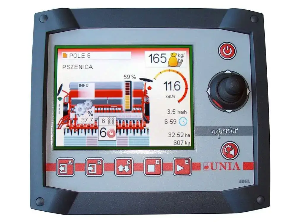 - Komputer SUPERIORKomputer SUPERIOR, funkcje: - rozwiązanie, które łączy różne maszyny marki UNIA i pozwala obsługiwać je na jednym panelu - nadanie nazw polom - nadanie nazw wysiewanym nasionom - bieżąca kontrola dawki siewu - elektroniczna kontrola próby kręconej - elektroniczna kontrola siewu - ilość nasion w zbiorniku - planowanie ścieżek technologicznych - informacja o pozycji znaczników przejazdowych