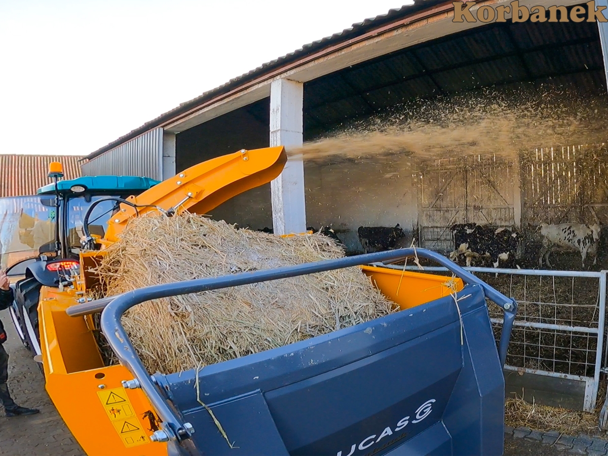 Nowa ściółka u krów za pomocą ścielarki Lucas i ciągnika Arbos