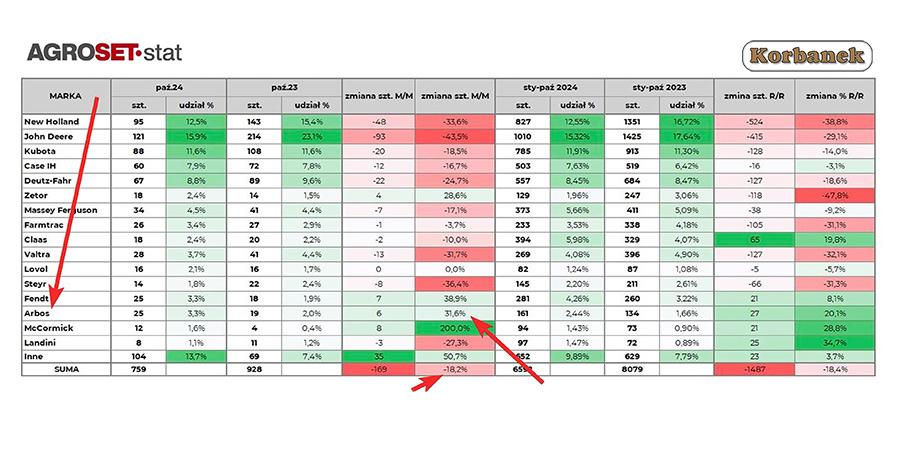 Marka Arbos może z dumą patrzeć na swoje osiągnięcia na polskim rynku w październiku 2024 roku, notując imponujący wzrost udziałów o +31,6%. W sytuacji, gdy rynek zmagał się z ogólnym spadkiem rejestracji ciągników (-18,2%), Arbos znalazł się w elitarnej grupie czterech marek, które zdołały zwiększyć swoje wyniki miesiąc do miesiąca, dystansując 14 innych konkurencyjnych marek w tej kategorii.