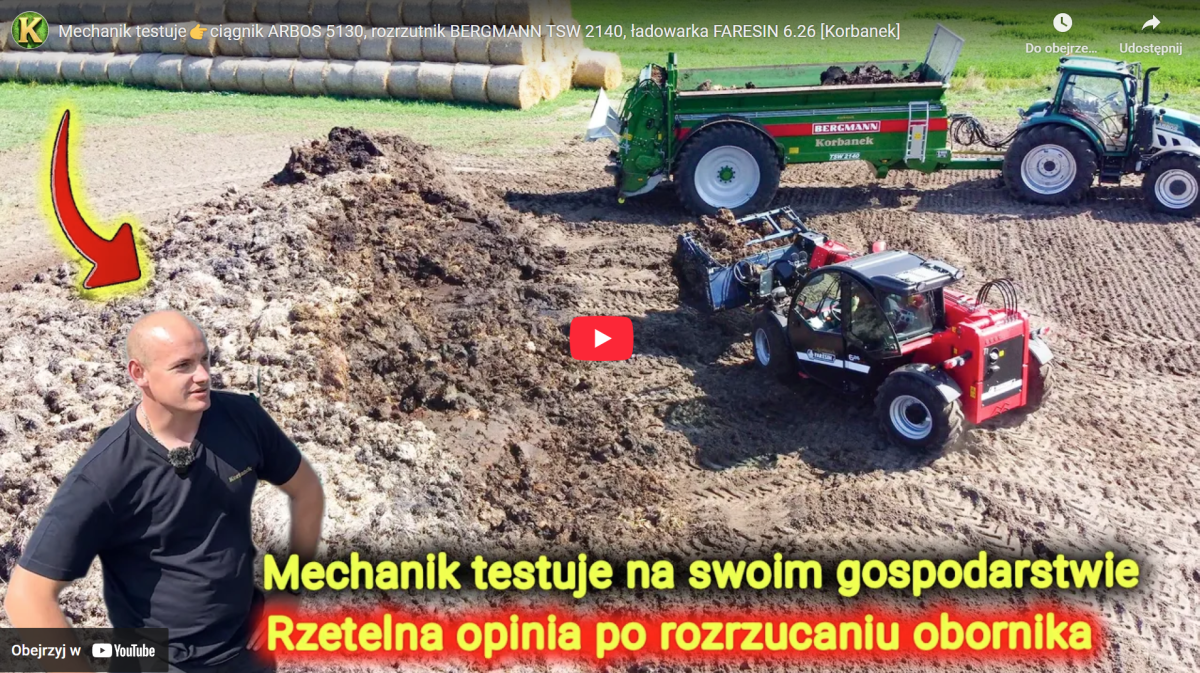 Rozrzucanie obornika z maszynami - ciągnik Arbos 5130 i rozrzutnikiem Bergmann TSW 2140
