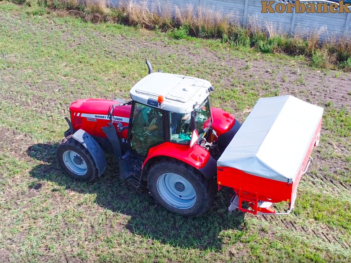 Kazik Kaszebe rozsiewa nawóz zestawem od Korbanka