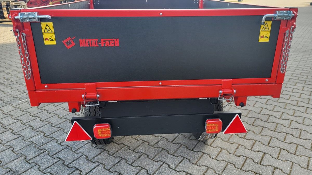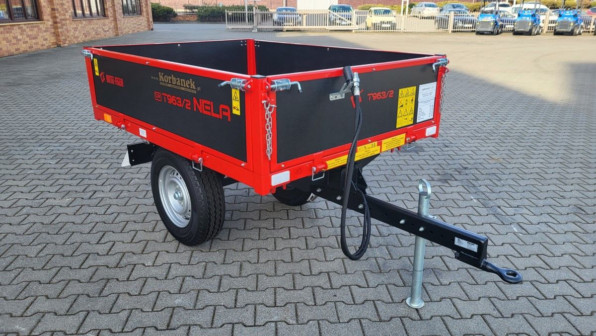 Przyczepa wywrotka 3-stronna jednoosiowa T963 Nela o ładowności od 1250kg do 1350kg to maszyna dedykowane dla mniejszych gospodarstw rolnych, ogrodników, sadowników i branży komunalnej. Ta nieduża przyczepa posiada POLSKĄ HOMOLOGACJĘ, co umożliwia jej zarejestrowanie i poruszanie się po drogach publicznych! Wywrotka ta nie posiada własnego układu hamulcowego. Dopuszczalna masa całkowita tej przyczepy to 1650 kg. Sprzęt charakteryzuje się lekką, solidną konstrukcją opartą w większości na profilach zamkniętych. Przyczepa posiada trójstronny wyładunek. Podłoga została wykonana z trwałej stali, natomiast burty wykonane są ze sklejki wodoodpornej. Powierzchnia załadunku jest dopasowana, aby było można zmieścić 2 lub 3 palety typu EURO! Standardowo przyczepy są wyposażone w oczko zaczepu fi35mm. Cechą przyczepy jest dyszel umożliwiający regulację wysuwu, mechaniczna stopka podporowa. Model T963 cechuje niskie położenie podłogi ułatwiające załadunek materiału oraz tylny i boczny, trójstronny wyładunek. Na uwagę zwraca sztywna i wyjątkowo szczelna konstrukcja. Wszystkie elementy skorupy zostały pokryte farbą chemoutwardzalną dwuskładnikową odznaczającą się wysoką trwałością i odpornością na czynnik UV. METALFACH umożliwia również malowanie burt na inne kolory z palety RAL. Na życzenie klienta istnieje opcja doposażenia przyczep w liczne udogodnienia i modyfikacje np. nadstawkę z siatki lub inny typ zaczepu.