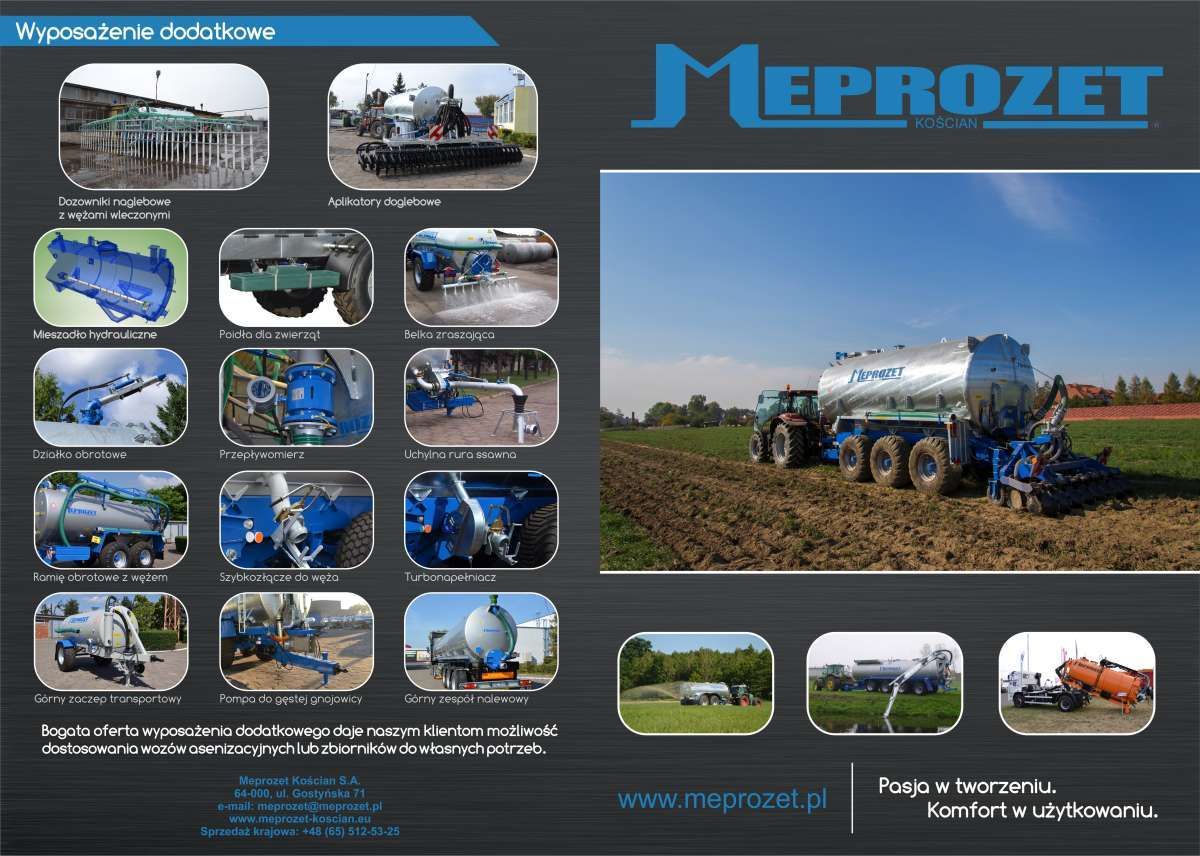 MEPROZET KOŚCIAN S.A. największy producent wozów asenizacyjnych w Polsce i jeden z największych w Europie. Kilkudziesięcioletnia tradycja budowy wozów asenizacyjnych, beczkowozów sprawia, że nasze wyroby są nowoczesne, trwałe i niezawodne. Firma corocznie wprowadza innowacje swoich wyrobów dostosowując się do zmieniających potrzeb rynku. Posiada pełną gamę aplikatorów naglebowych i doglebowych o różnych szerokościach roboczych. Meprozet Kościan S.A., w swoich produktach stosują sprawdzone rozwiązania, poparte wieloletnią praktyką, sprawdzoną zarówno u klientów, jak i podczas testów polowych. Maszyny wyróżnia solidna konstrukcja, dobrej jakości ocynk, oraz dobre zachodnie podzespoły takie jak: osie, kompresory, zawory, czy też ogumienie.